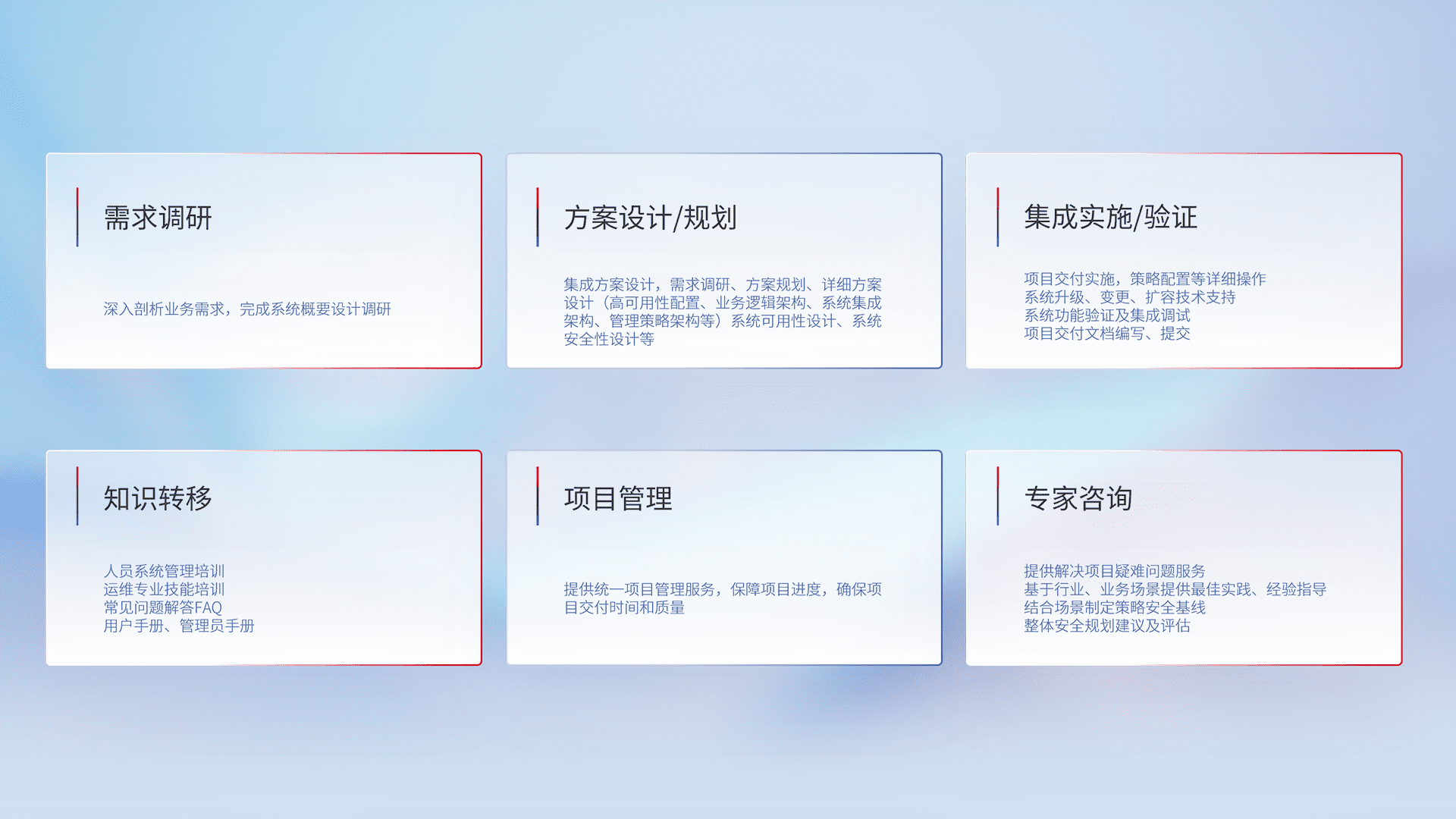 针对客户行业特性,,将宏观的安全战略和需求,,,通过专业的交付服务,,,实现项目落地,,,为客户提供标准规范的集成交付服务。。。